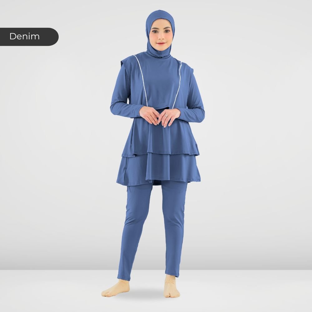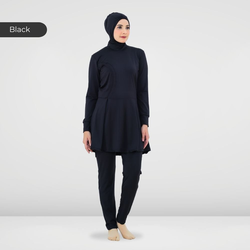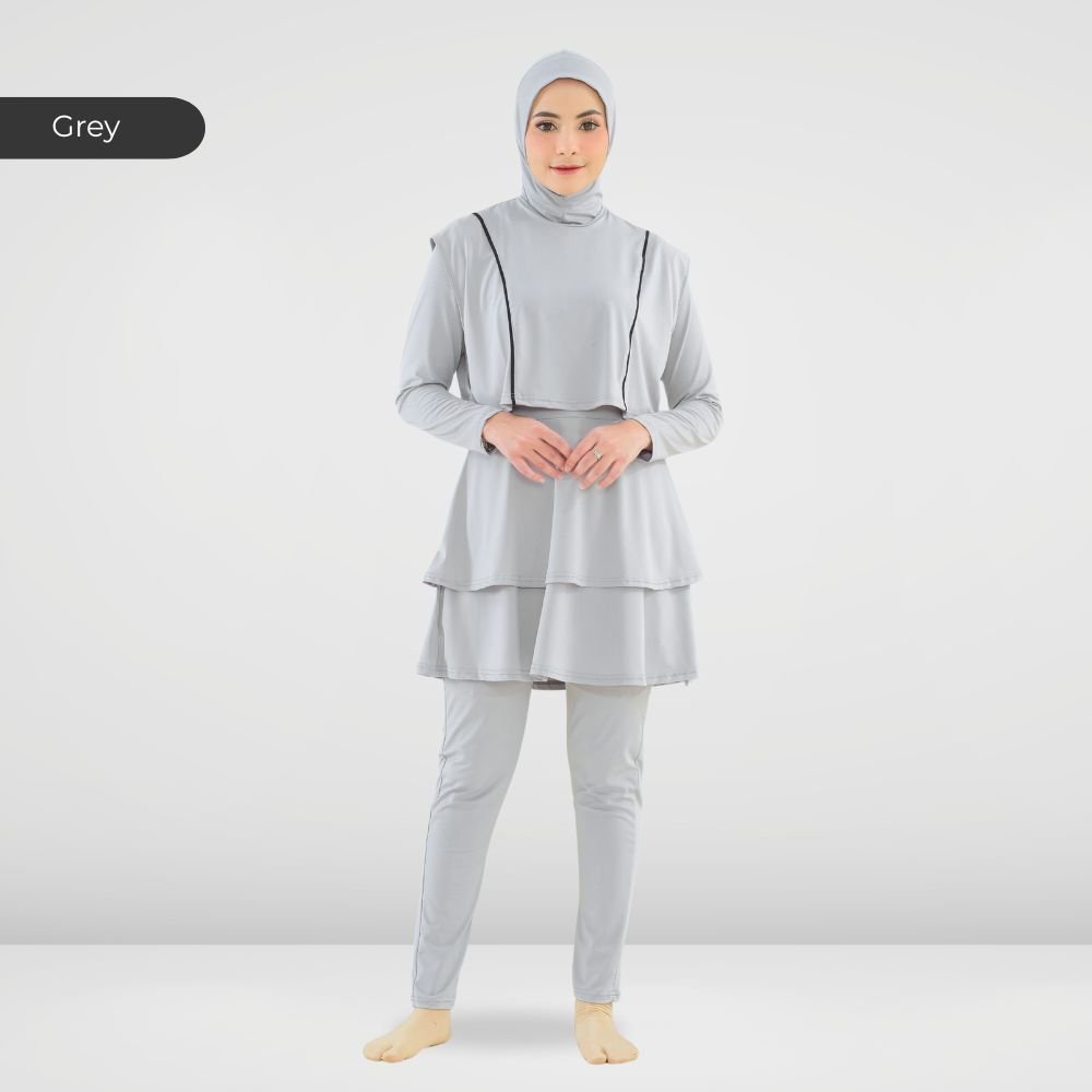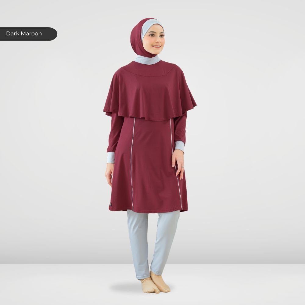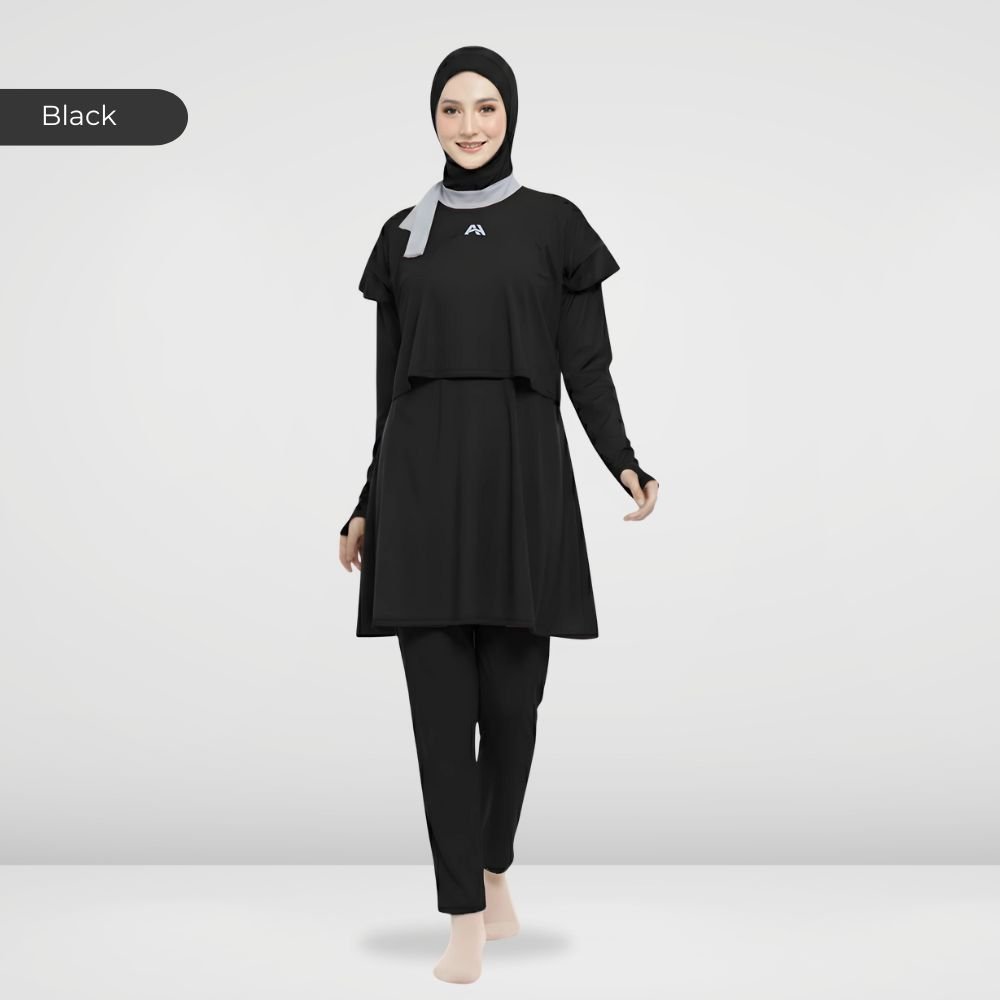 Setelan renang Muslimah dengan model Jumpsuit sehingga praktis dan ringkas saat berenang disertai dengan layer dibagian dada dan rok yang memberi kesan syar’i dan sopan. Terdapat bukaan zipper pada bagian belakang. Menggunakan material Jersey Dryfit berkualitas tinggi, yang bersifat elastis/flexibel, ringan dan lebih cepat kering. Jahitan berkualitas, kuat dan rapat.