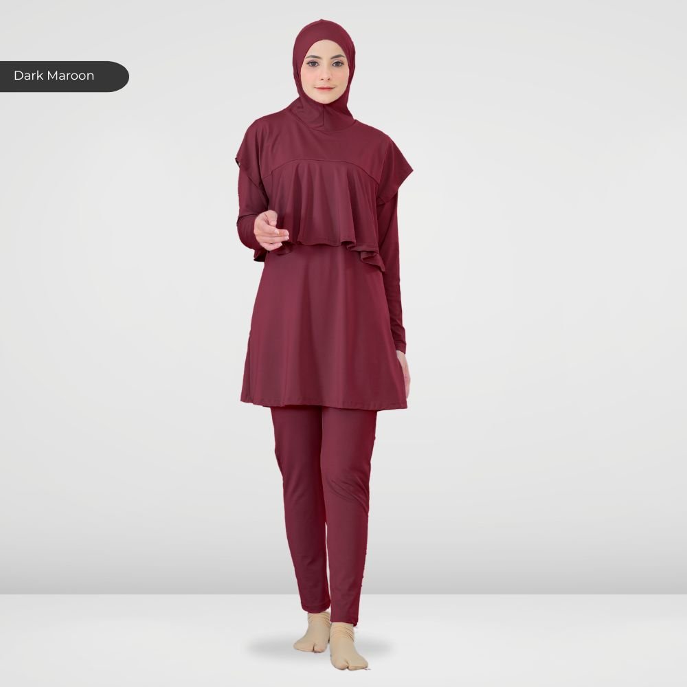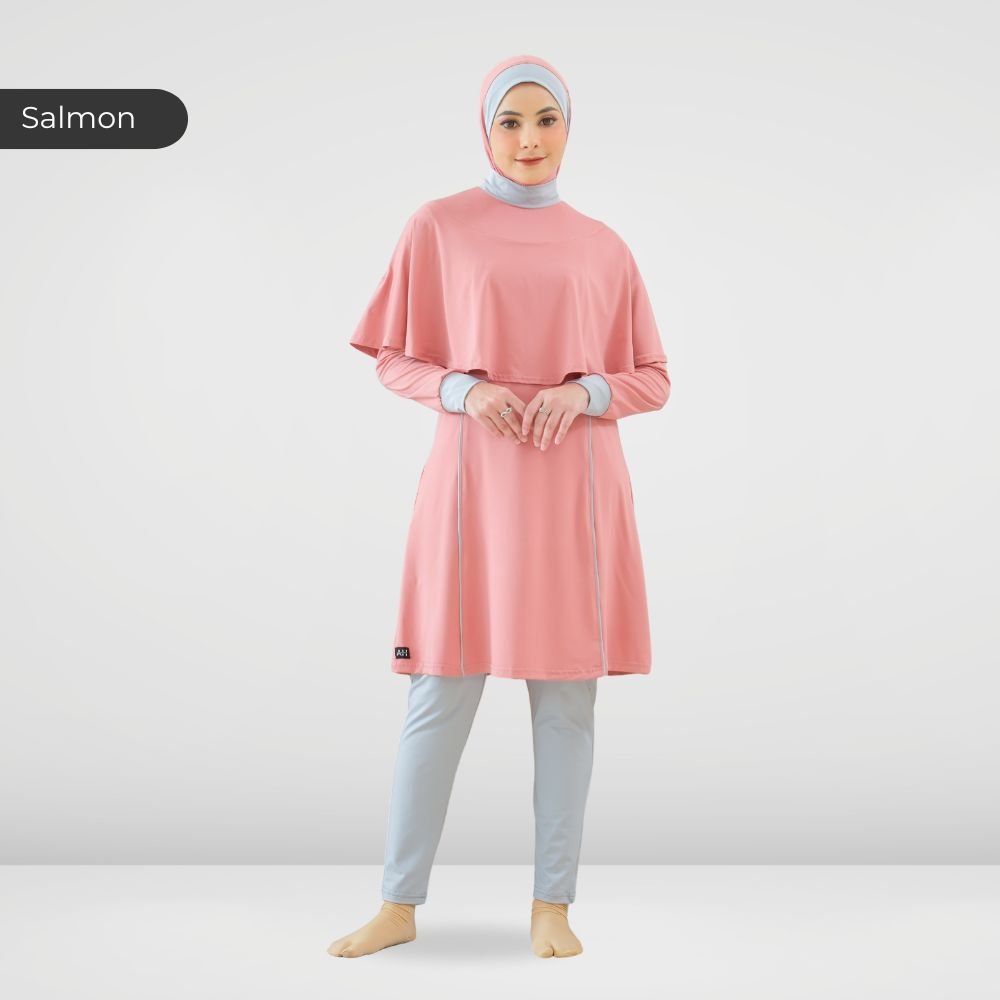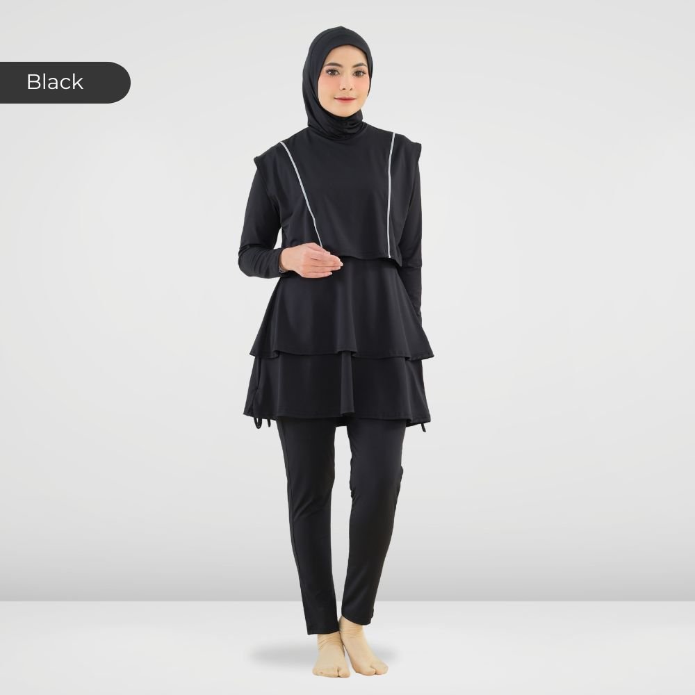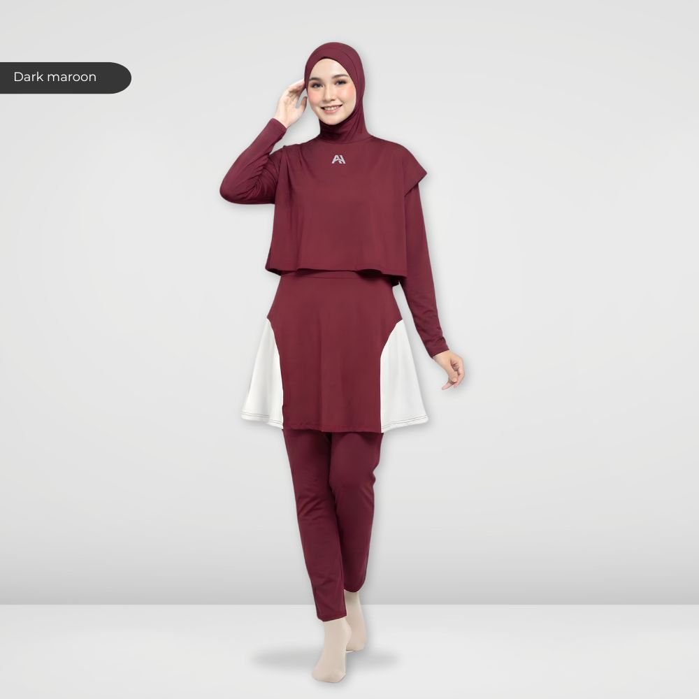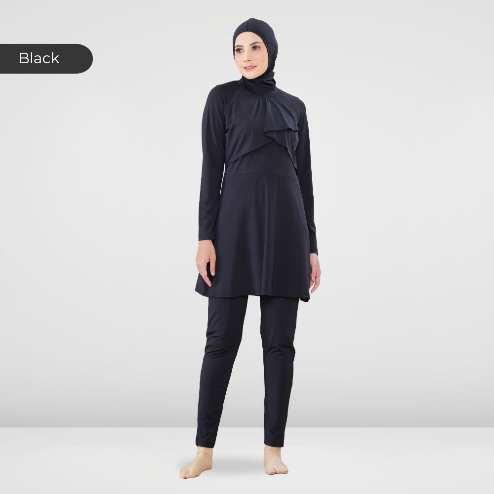 Setelan renang Muslimah dengan model Jumpsuit sehingga praktis dan ringkas saat berenang disertai dengan layer dibagian dada dan rok yang memberi kesan syar’i dan sopan. Terdapat bukaan zipper pada bagian belakang. Menggunakan material Jersey Dryfit berkualitas tinggi, yang bersifat elastis/flexibel, ringan dan lebih cepat kering. Jahitan berkualitas, kuat dan rapat.