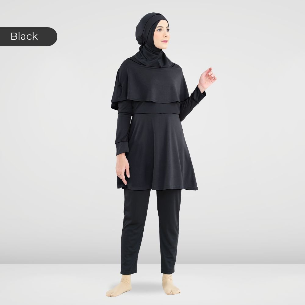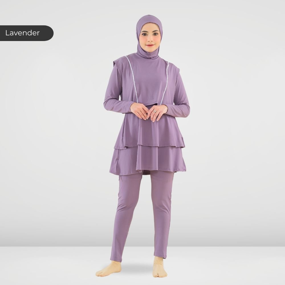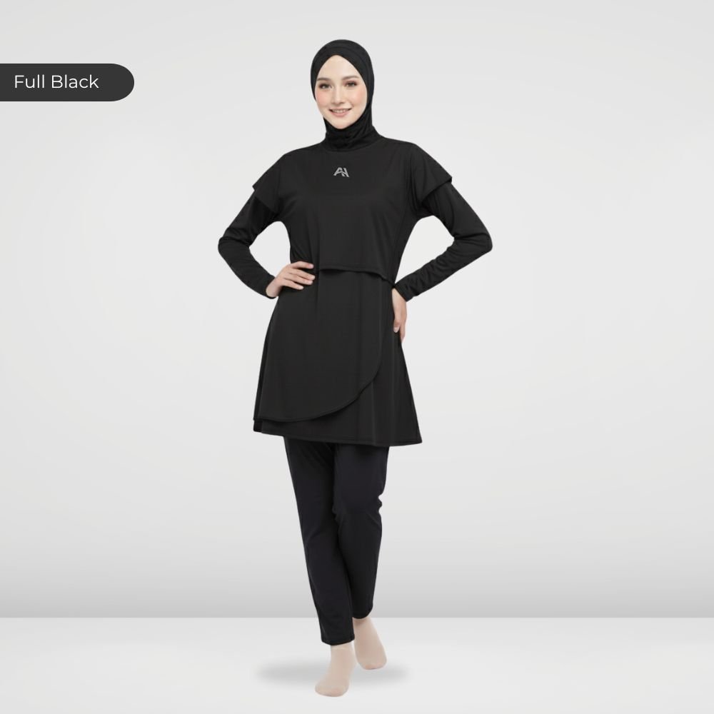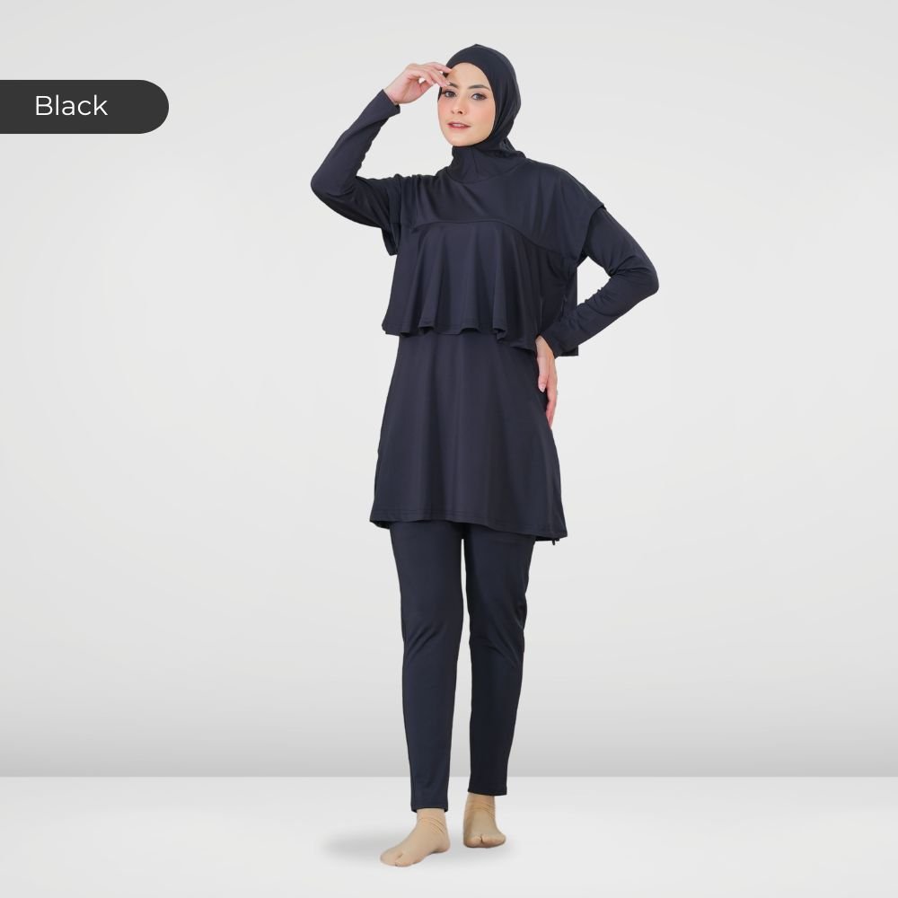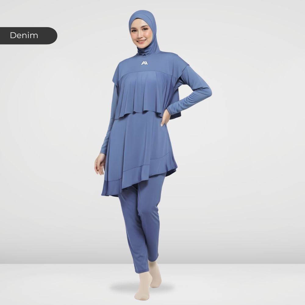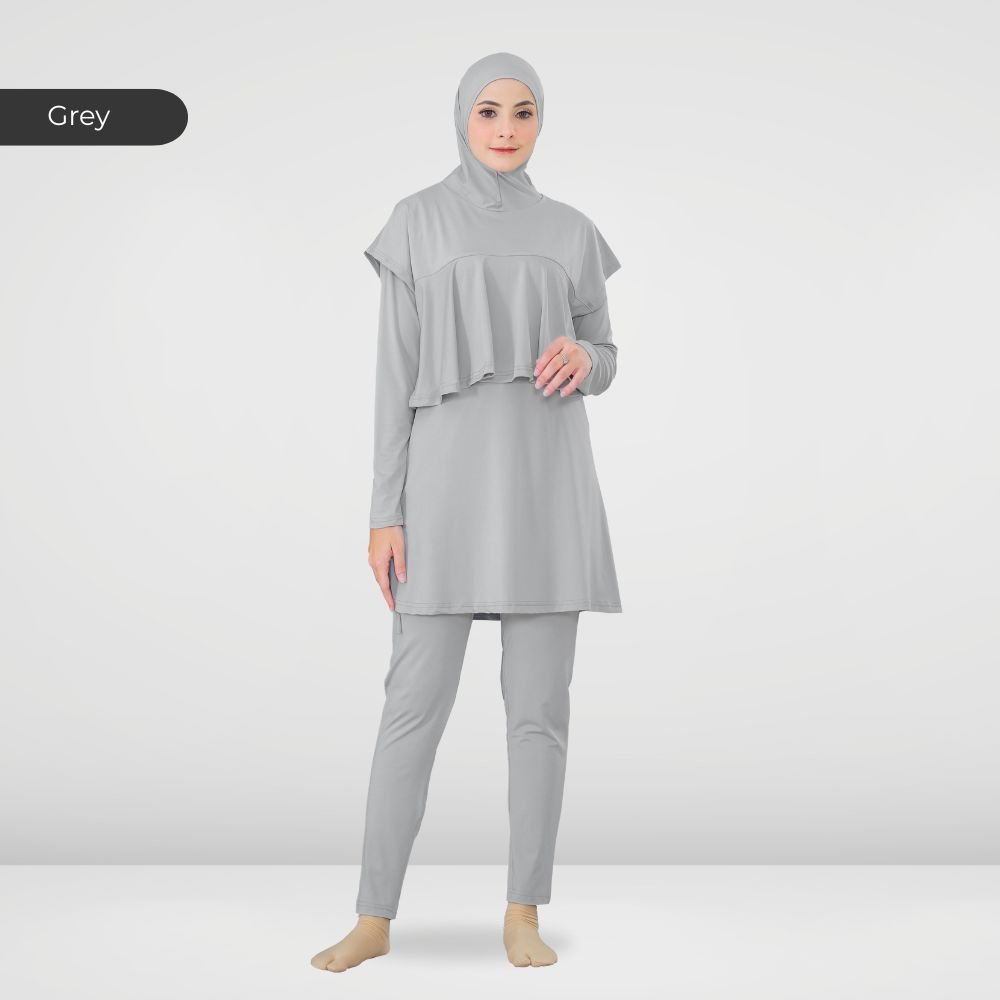 Setelan renang Muslimah dengan model Jumpsuit sehingga praktis dan ringkas saat berenang disertai dengan layer dibagian dada dan rok yang memberi kesan syar’i dan sopan. Terdapat bukaan zipper pada bagian belakang. Menggunakan material Jersey Dryfit berkualitas tinggi, yang bersifat elastis/flexibel, ringan dan lebih cepat kering. Jahitan berkualitas, kuat dan rapat.