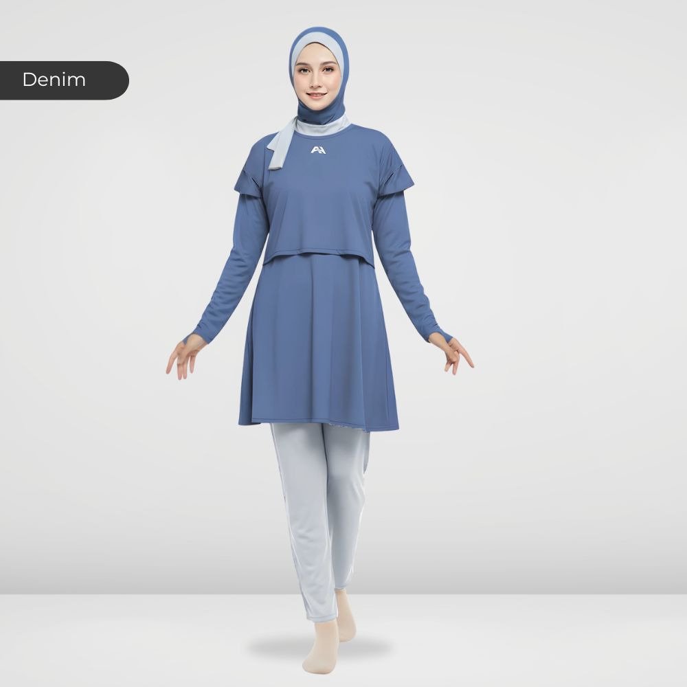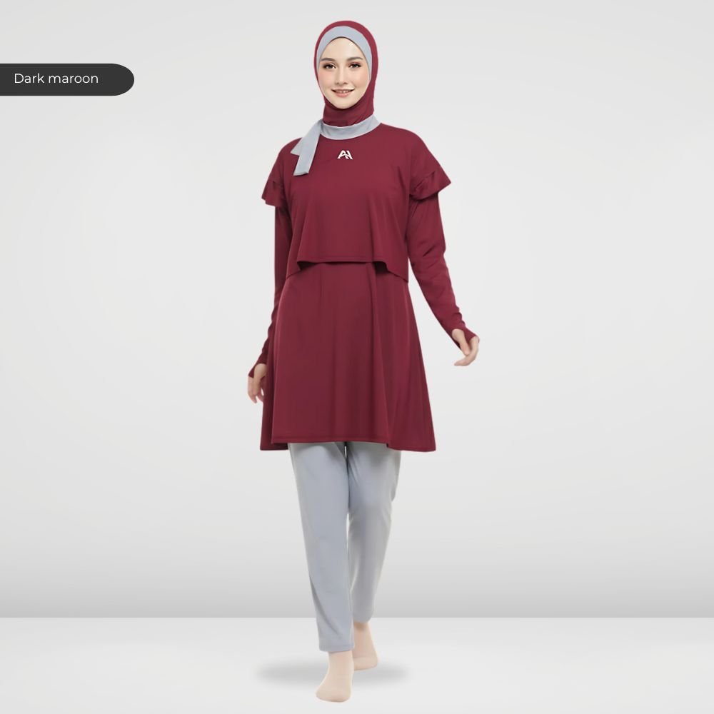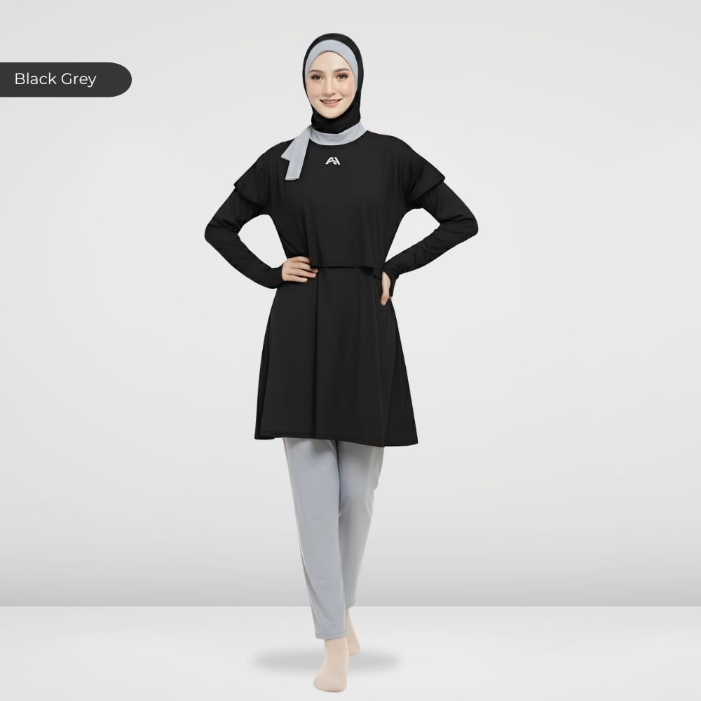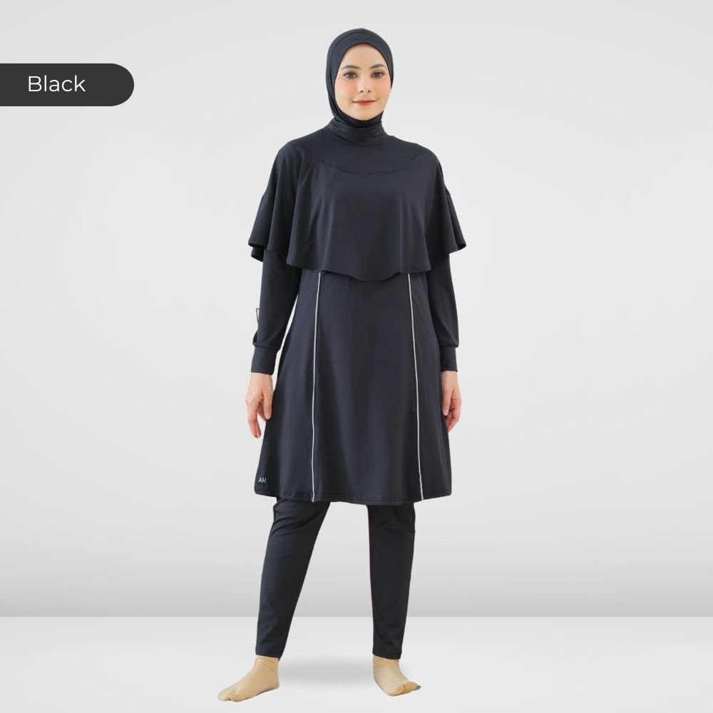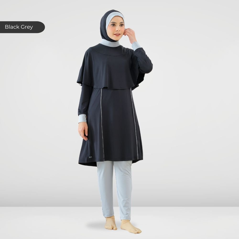 Setelan renang Muslimah dengan model Jumpsuit sehingga praktis dan ringkas saat berenang disertai dengan layer dibagian dada dan rok yang memberi kesan syar’i dan sopan. Terdapat bukaan zipper pada bagian belakang. Menggunakan material Jersey Dryfit berkualitas tinggi, yang bersifat elastis/flexibel, ringan dan lebih cepat kering. Jahitan berkualitas, kuat dan rapat.