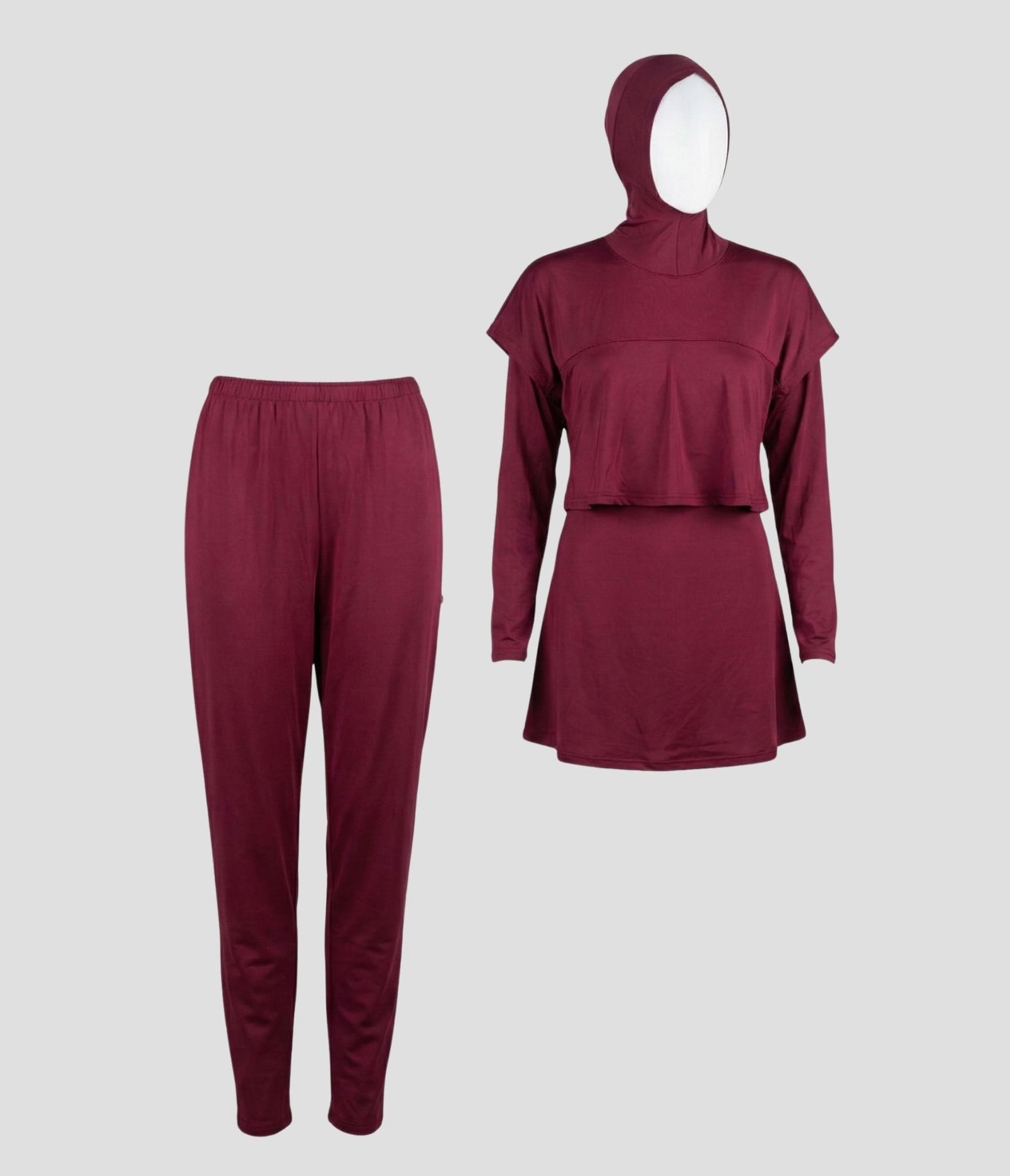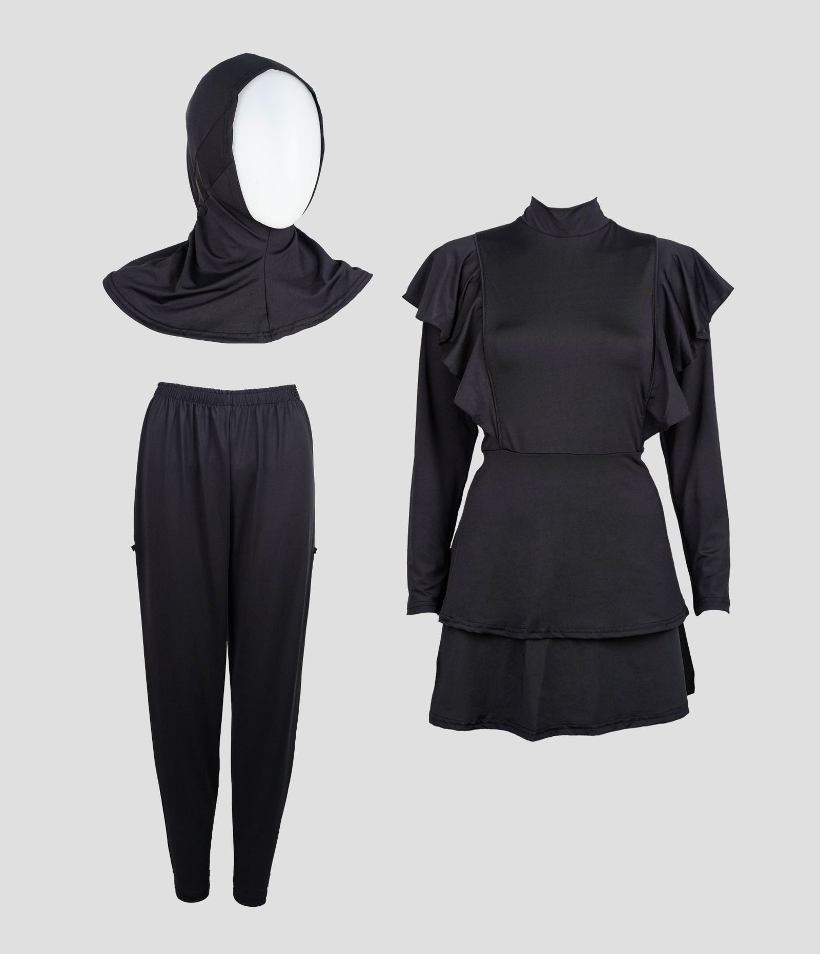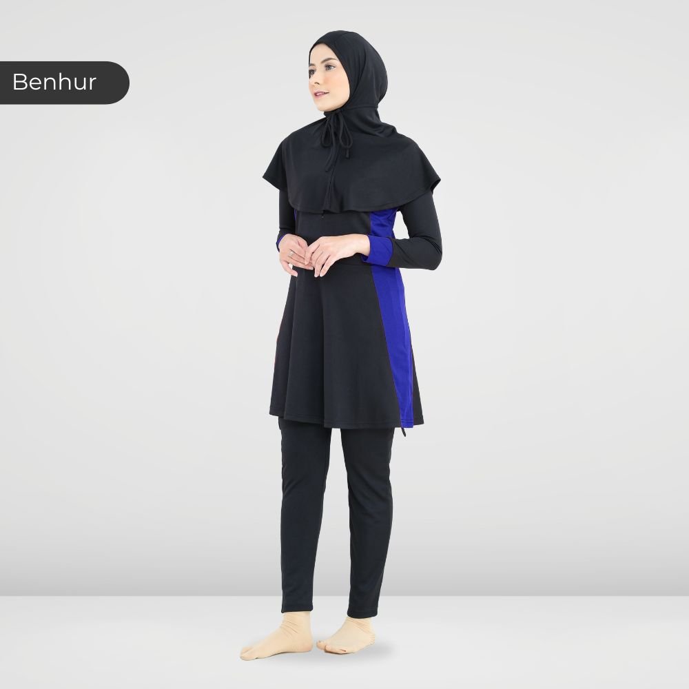 - Terdiri dari: hijab renang, baju renang dan celana renang.