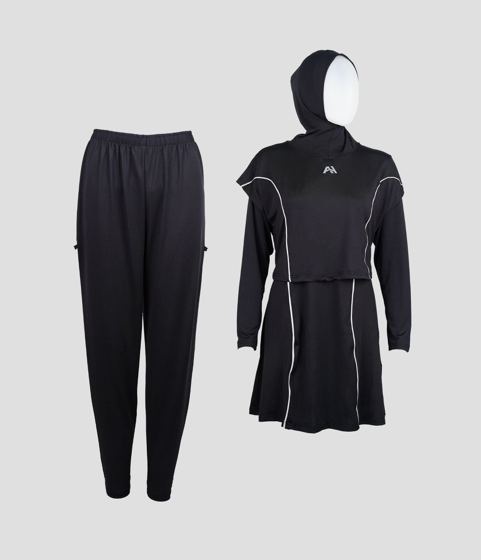 - Terdiri dari hijab yang dijahit menyatu dengan baju renang dan celana renang.