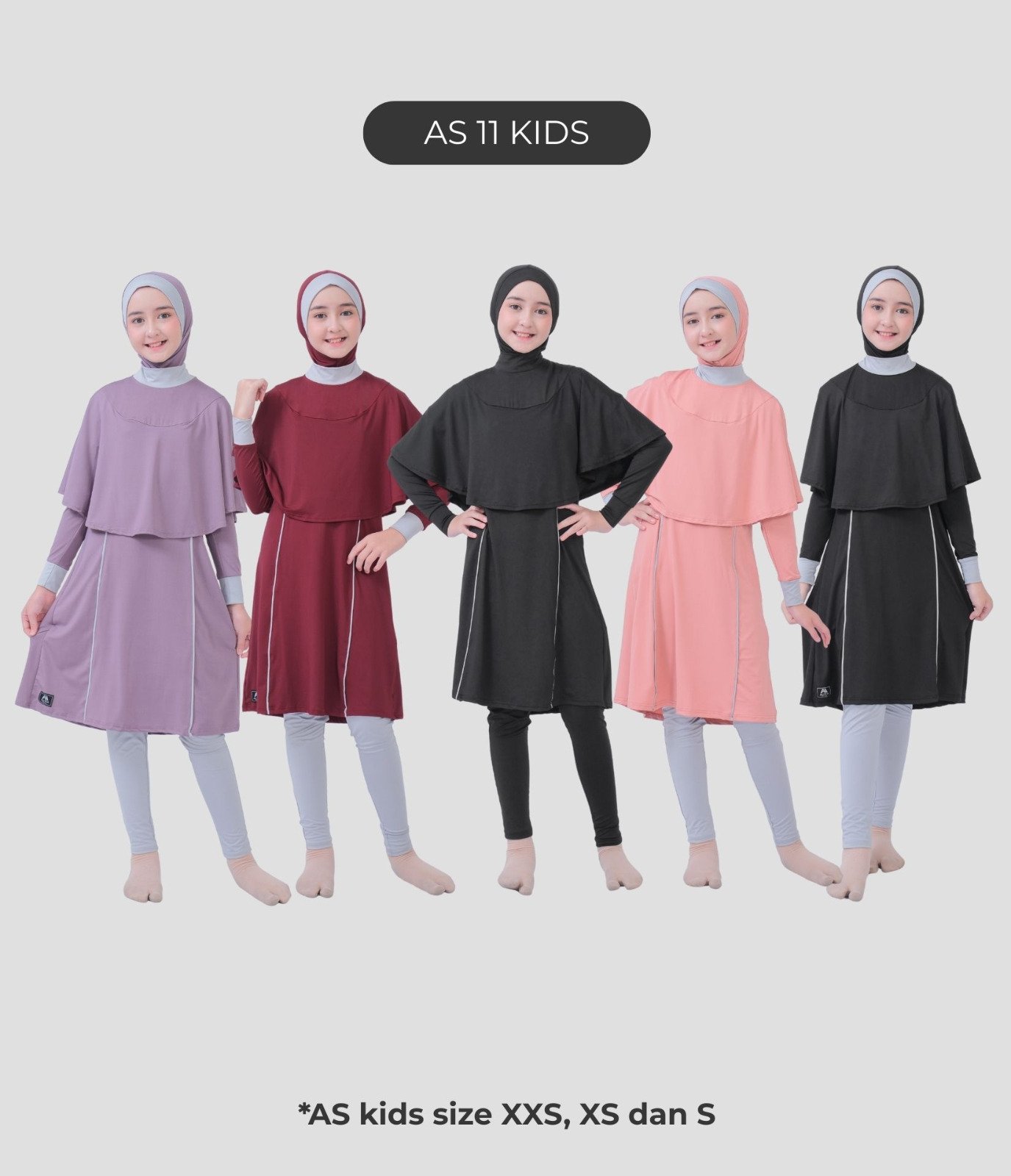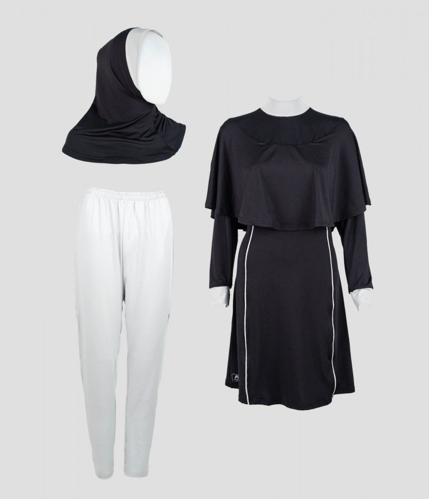 - Terdiri dari hijab yang dijahit menyatu dengan vest, baju renang yang menyatu dengan rok, dilengkapi dengan celana pendek/short pants dibagian dalam rok dan celana renang.